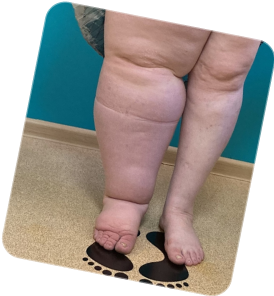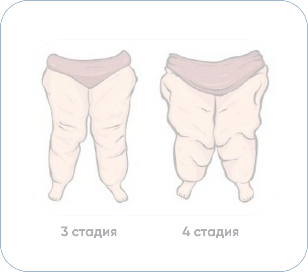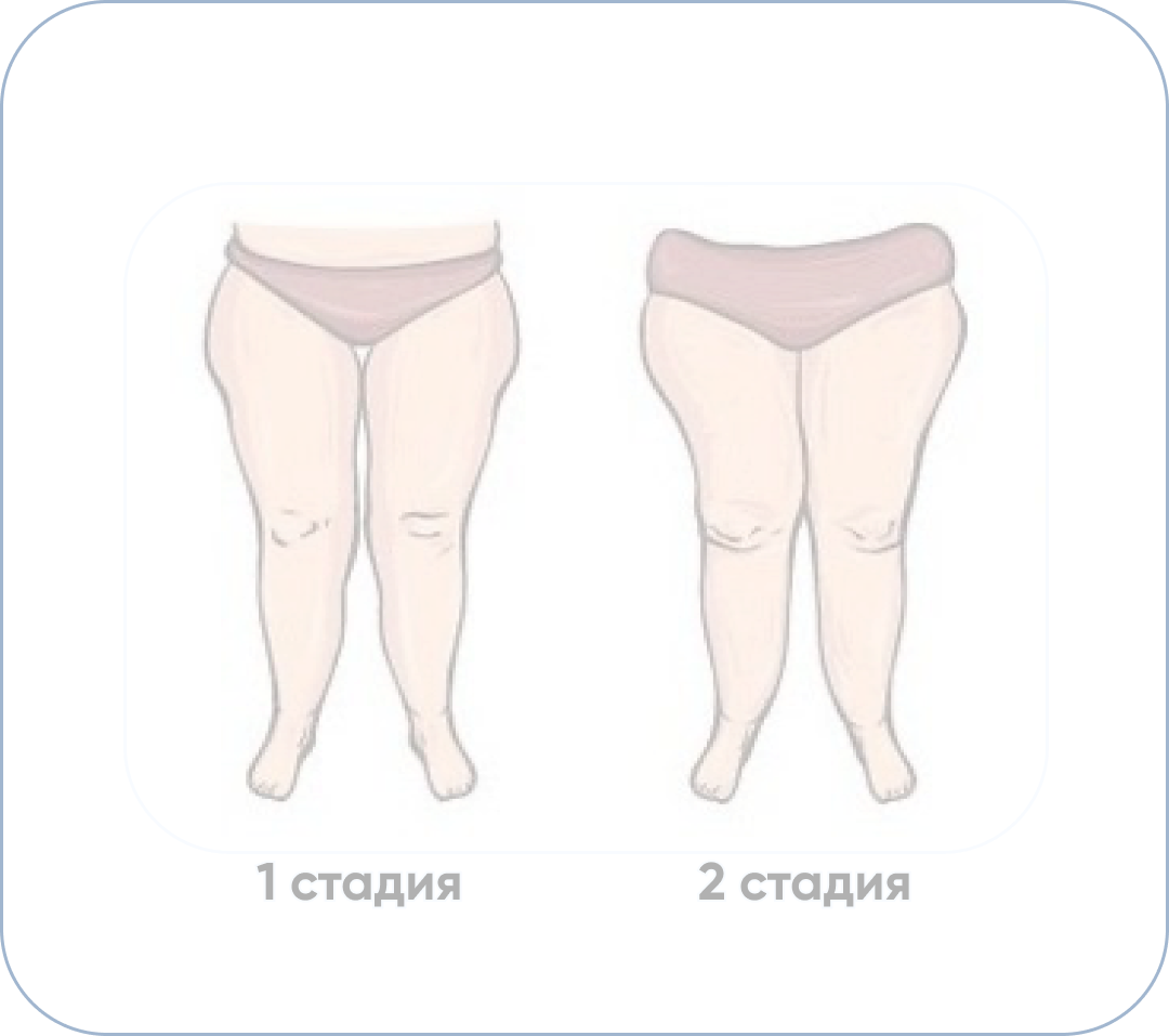 Неровная и бугристая кожа становится еще более заметной, начинается деформация контуров, появляется тяжесть при ходьбе. Возникает лимфостаз и липедема становится лимфолипедемой